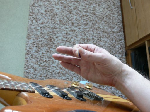 Tällaisenkin ihmeellisyyden huomasin omassa tekniikassani. Kutsun tätä piiskan iskuksi. Tällä tekniikalla on käytännössä mahdotonta osua pelkästään yhteen kieleen vaan vasemman käden täytyy huolehtia siitä että viereiset kielet on sammutettu. Kuten arvata saattaa, tämä saattaa olla hupaa kielille. Plektrasta pitää opetella melko joustava ote tai sitten pitää käyttä riittävän taipuisaa plektraa.